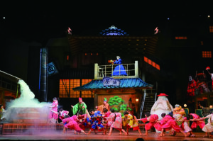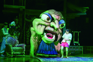 무대는 이 여정을 시각적으로 보여준다. 온천탕은 2층 규모의 목재 구조물로 세워지고, 360도로 회전하는 세트는 음식점에서 온천탕으로, 다시 유바바의 집무실로 이어지며 시공간을 확장한다. 치히로의 부모가 돼지로 변하는 장면과 유바바가 분노를 표출하는 장면에서는 지브리 그림체를 닮은 돼지 탈과 유바바의 이목구비 탈이 등장하는데, 우스꽝스럽지 않으면서도 환상을 현실로 끌어오는 데 설득력이 있다.
