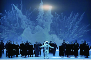 로버트 윌슨(1941~2025)도 ‘메시아’(모차르트 판본)에 새로운 연출을 불어넣어 2020년 잘츠부르크 음악제에서 선보였다. 하얗게 분장한 가수들, 빙산과 우주인 등 상징적 캐릭터, 빛에 의한 명암의 대비, 특유의 청색 톤 등으로 초현실적 미장센을 만들었다. 윌슨은 2015년에도 아르보 패르트(1935~)의 네 작품을 묶은 연출 작품 ‘아담 수난곡’으로 화제를 모았다. 빛으로 만드는 청색 이미지와 그림자, 그리고 극도로 절제된 슬로 모션은 시간을 왜곡하고 명상의 침잠으로 이끈다. 에스토니아 탈린에서 열린 초연에서는 관현악단과 합창단을 객석 뒤와 측면 높은 곳에 배치하고 소리가 위에서 내려오도록 하여 종교적 숭고함을 느끼도록 한 것도 주목할 점이다.